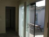 Sliding doors open from the master bedroom to the patio.