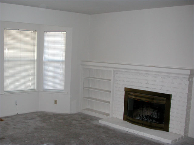 Living room bay window and fireplace.